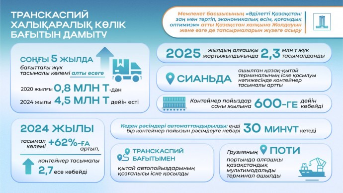 Транскаспий бағыты бойынша қытай автопойыздарының қозғалысының басталуы да маңызды оқиғалардың бірі болды: 2024 жылы Құрық порты арқылы 3,5 мыңға жуық жүк көлігі өтті, ал биылғы жылдың алғашқы жартысында олардың саны мыңнан асты.