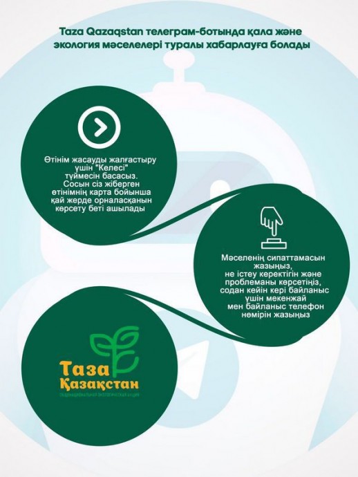 Арнайы телеграм-бот арқылы аумақтарды абаттандыру және санитарлық тазалау мәселелері бойынша өтінімдер жолдай аласыздар. Сонымен қатар, мәселені сипаттап, фотосуретті тіркеп, нақты мекенжайды картадан көрсету мүмкіндігі қарастырылған.