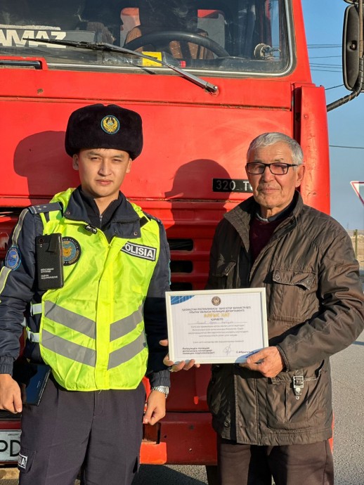Ұлытау облысында жол қозғалысы қауіпсіздігін қамтамасыз ету және жүргізушілер арасында құқықтық мәдениетті арттыру мақсатында патрульдік полиция қызметкерлері үлгілі көлік жүргізушілерін марапаттады.